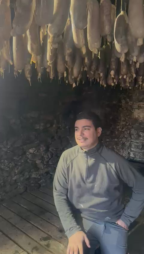Le Figatellu Nustrale des frères Tambini est un produit d’exception issu exclusivement de porcs de race corse (Nustrale), élevés en semi-liberté et nourris naturellement auxchâtaignes et aux glands. Héritiers de plus de 40 ans de savoir-faire familial, Ange et Nicolas perpétuent une fabrication traditionnelle, respectueuse des cycles saisonniers et des méthodes anciennes.